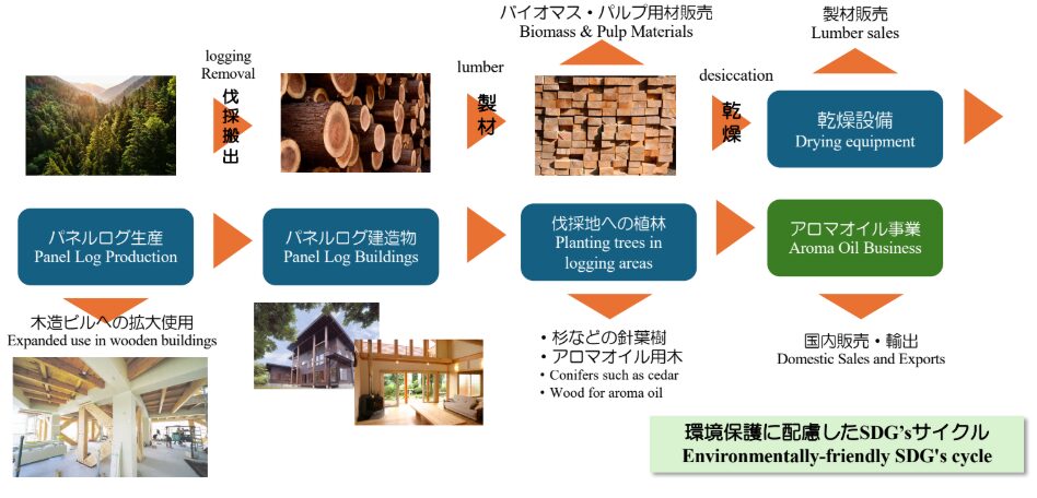 日本の森林資源の活用、林業復活を目指した福島県南会津の企業とタイアップし、当該ビジネスに着手致しました。同社の間伐材を活用した「パネルログ」(特許取得)を開発し、縦ログハウス、パネルログモジュールの大型建造物への適用は日々進化を遂げております。