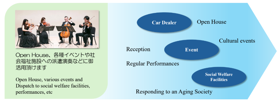 Mainly for small-scale events, we will carry out a higher-level production centered on string performance. The first-class performance coordinator affiliated with our company will provide artists who work as soloist who are active in the suburbs of Tokyo with the best unit each time. We also cover a wide range of music genres. It can be used widely, such as corporate welfare events, social welfare facilities, and cultural events related to education.